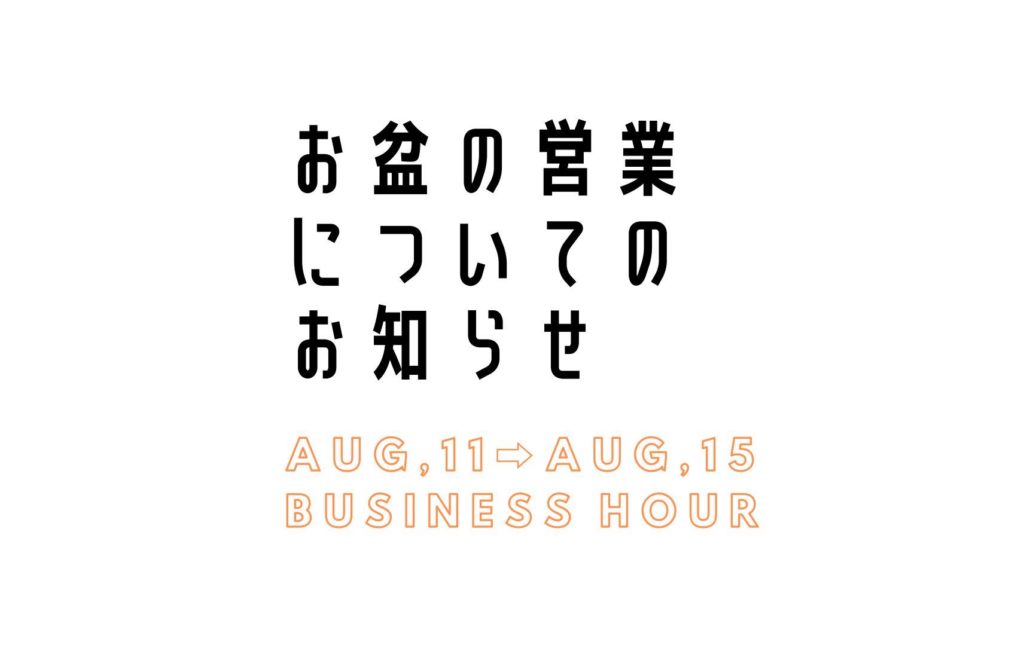 8月11日(祝・月曜日) 営業/Aug,11 OPEN8月12日 (火曜日)営業/Aug,12 OPEN 8月13日(水曜日)休み/Aug,13 CLOSE 8月14日 (木曜日)営業/Aug,14 OPEN8月15日(金曜日)営業 /Aug,15 OPEN※営業時間の変更もございません 13:00から18:00まで